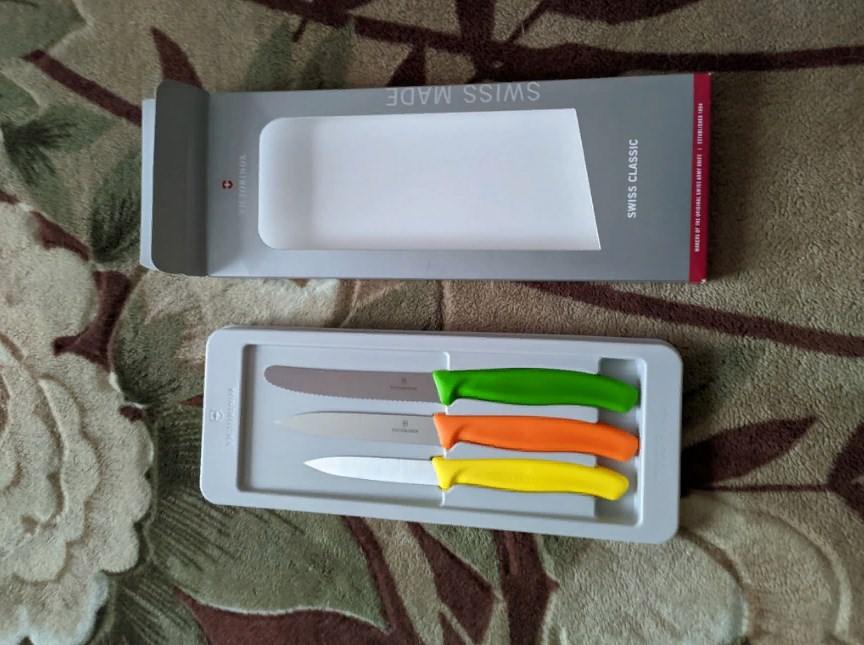 Набор из 3 ножей VICTORINOX Swiss Classic: жёлтый нож для овощей 8 см, оранжевый нож для овощей 10 см, чёрный столовый нож с серрейторной заточкой 11 см, пластиковая рукоять, в подарочной коробке.